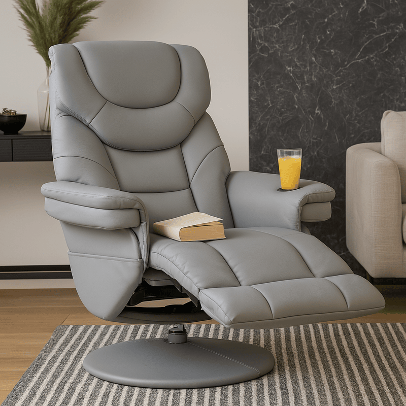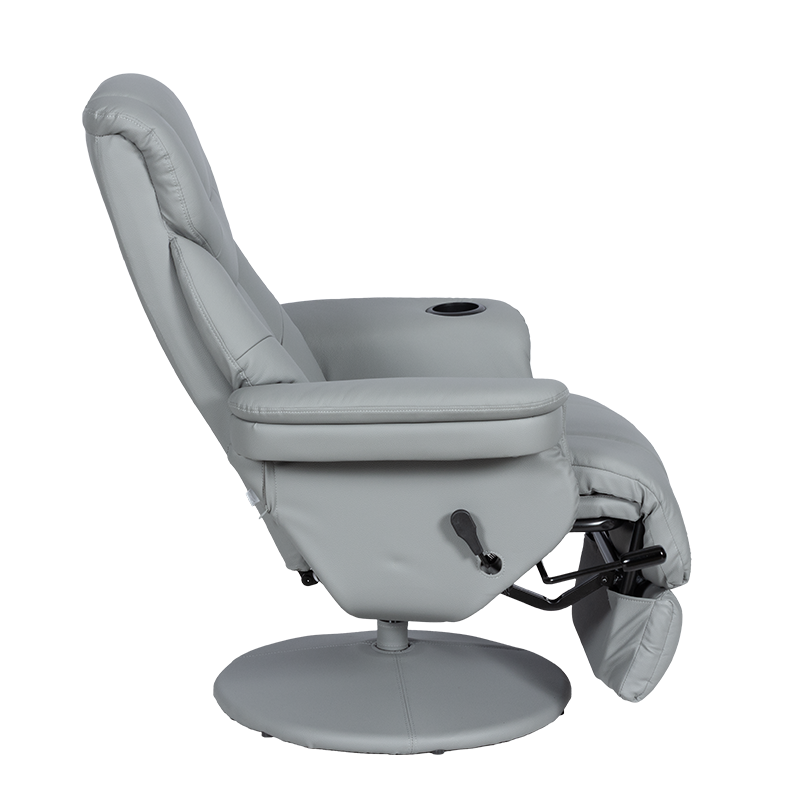 Кресло TIA е създадено за съвършен комфорт и истински моменти на отдих. Изработено от висококачествена еко кожа, моделът разполага с два независими релакс механизма за регулиране на поставката за крака и облегалката – и в тандем разгръщат креслото в почти легнало положение, създадено за безвремие. Вграденият джоб под левия подлакътник побира удобно книга или дистанционно, а вградената поставка за чаша допълва усещането за уют. Здрава метална основа с праховобоядисано покритие, облицована с еко кожа, осигурява стил и стабилност, а 360-градусовото въртене гарантира пълна свобода на движение. Пълна информация за размерите и характеристиките на модела ще намерите в таблицата в таб/поле 'Техническа информация'.