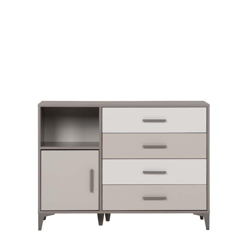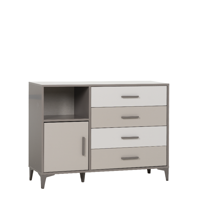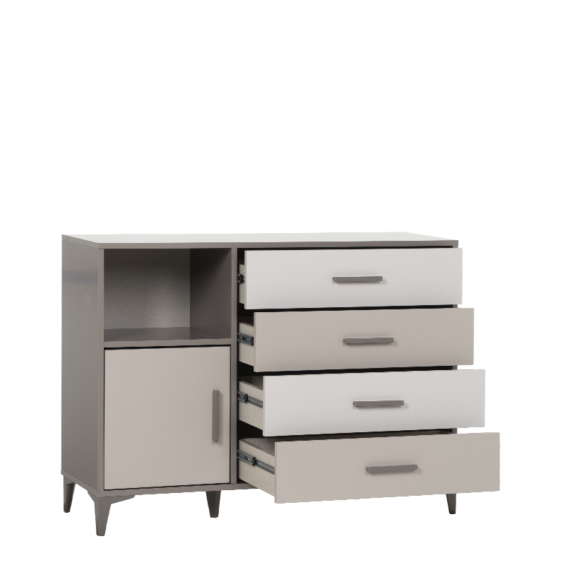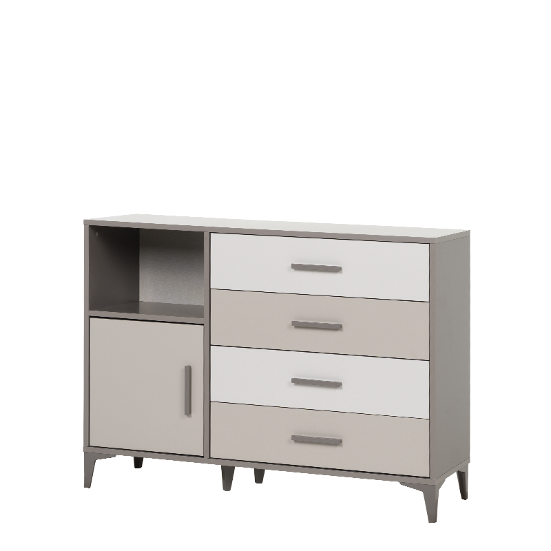 Детският скрин RIGA комбинира четири чекмеджета и еднокрилен шкаф, които осигуряват достатъчно място за съхранение на дрехи и аксесоари. Всички врати и чекмеджета са оборудвани с механизми и панти с плавно затваряне за по-тиха и сигурна употреба. Моделът е изработен от ПДЧ 18 мм, с ABS дръжки и високи ABS крака (12 см), подходящo за почистване с прахосмукачка робот. Пълна информация за размерите и характеристиките на модела ще намерите в таблицата в таб/поле 'Техническа информация'.