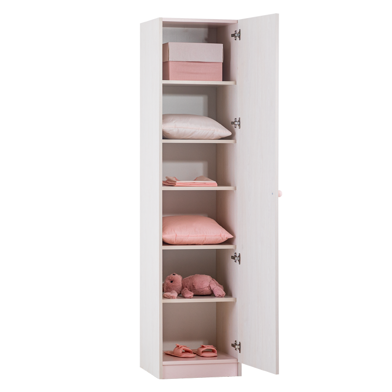 Еднокрилният гардероб POLLINA е стилно и удобно решение за допълнително съхранение в детската стая. С компактните си размери и модулен дизайн, той се вписва лесно в различни конфигурации и може да се комбинира с други мебели от серията. Посоката на отваряне на вратата може да се избере според предпочитанията и разположението в стаята. Моделът разполага с 5 регулируеми рафта, всеки с товароносимост до 25 кг, а вратата се затваря плавно и безшумно благодарение на специалните панти със спирачка. ABS дръжката е здрава и удобна, а корпусът е изработен от висококачествени материали, подходящи за детски интериор. Пълна информация за размерите и характеристиките на модела ще намерите в таблицата в таб/поле 'Техническа информация'.