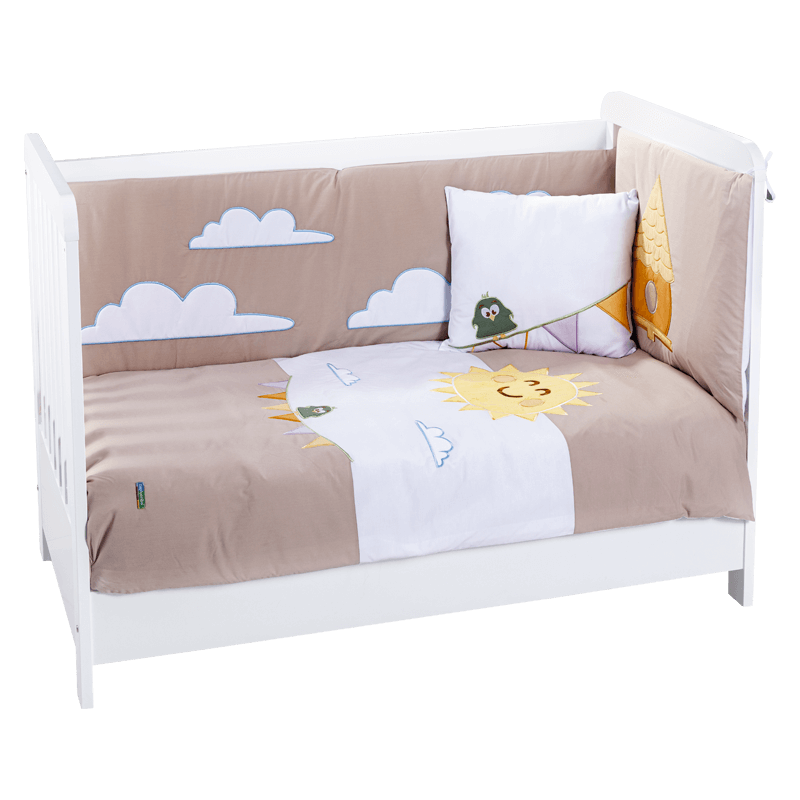 KAKULE е очарователен детски спален комплект, който носи топлина и уют в стаята на най-малките. Декориран в нежни тонове с весели мотиви на облаци и слънце, той създава спокойна атмосфера за сън и игра. Комплектът включва плик за завивка (92x148 см), завивка (92x148 см), чаршаф (116x164 см), възглавница за глава (46x46 см) с калъфка (36x46 см), както и обиколници – страничен (48x148 см) и над глава (48x82 см). Изработен е от висококачествени, щадящи кожата материали, подходящи за ежедневна употреба. Пълна информация за размерите и характеристиките на модела ще намерите в таблицата в таб/поле 'Техническа информация'.