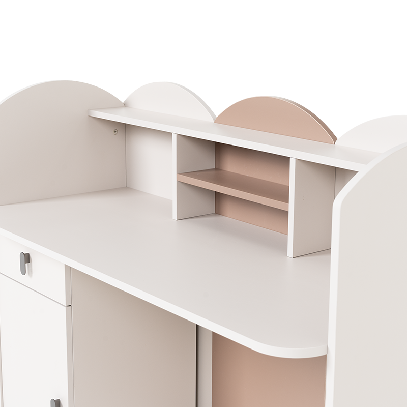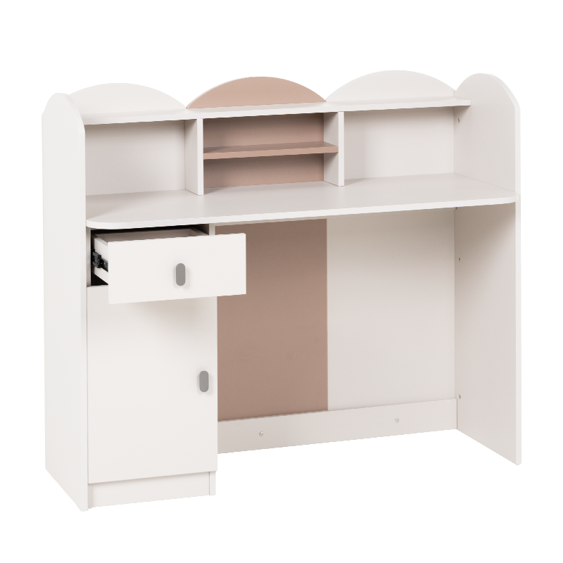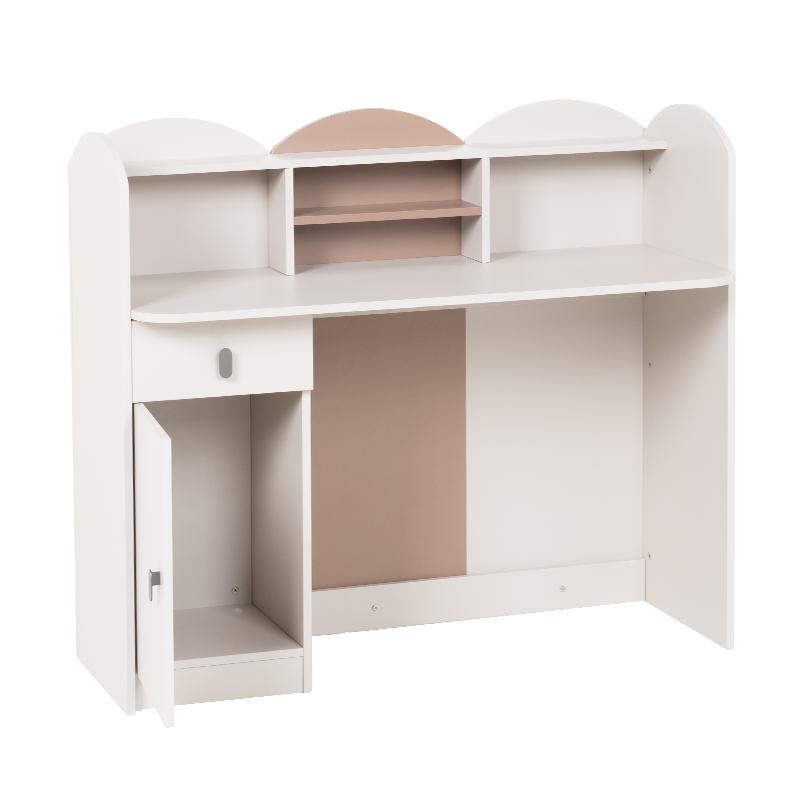 Бюро Pasig впечатлява с оригинален и заоблен дизайн, съчетаващ функционалност и нежна естетика, подходяща за детска или тийнейджърска стая. Множеството ниши и рафтове предлагат организирано пространство за книги, аксесоари или декоративни елементи. Шкафчето и чекмеджето с плавно затваряне улесняват подреждането на учебни пособия и лични вещи. Задната цветна панелна част придава завършен и хармоничен вид. Пълна информация за размерите и характеристиките на модела ще намерите в таблицата в таб/поле 'Техническа информация'.