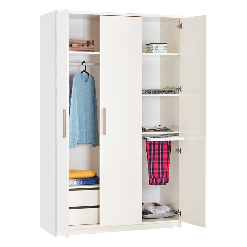 Трикрилният гардероб JOYIN е стилно и практично решение за съхранение в детската стая. Съчетанието от 5 рафта, просторен лост за закачалки, телескопична закачалка за панталони и 2 чекмеджета създава перфектна организация за дрехи и аксесоари. Всички врати и чекмеджета са снабдени с механизми за плавно затваряне – за максимално удобство и безопасност. Гардеробът се комбинира чудесно с останалите елементи от колекцията за постигане на завършен и хармоничен интериор. Пълна информация за размерите и характеристиките на модела ще намерите в таблицата в таб/поле 'Техническа информация'.