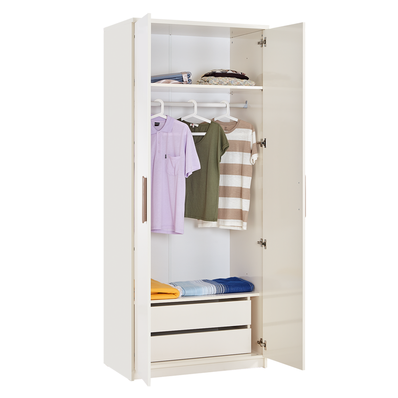 Детският гардероб JOYIN с две врати е елегантно решение, което съчетава удобство и стил в една изчистена форма. Вътрешното му пространство е прецизно организирано – два практични рафта, един лост за закачалки и две чекмеджета, които осигуряват достатъчно място за всякакви детски съкровища – от дрешки до аксесоари. Механизмите за плавно затваряне правят ежедневното използване не само приятно, но и безопасно. Идеален за комбиниране с останалите модули от линията JOYIN – за цялостна визия, която вдъхновява. Пълна информация за размерите и характеристиките на модела ще намерите в таблицата в таб/поле „Техническа информация“.