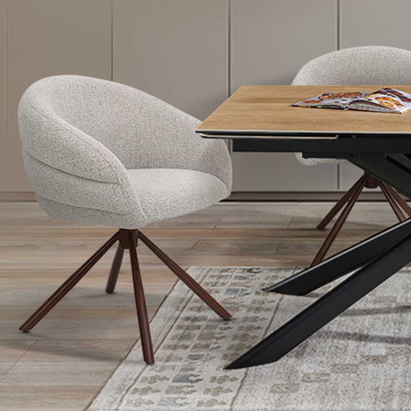 Трапезен стол NAMKA привлича вниманието с елегантен силует и мек, обгръщащ дизайн. Тапицерията от висококачествена дамаска и комфортните подлакътници създават усещане за уют при всяко сядане. Моделът разполага със стабилна въртяща се основа от праховобоядисан метал, която съчетава стил и функционалност. Подходящ както за трапезарията, така и за кът за работа или срещи. Пълна информация за размерите и характеристиките на модела ще намерите в таблицата в таб/поле "Техническа информация".
