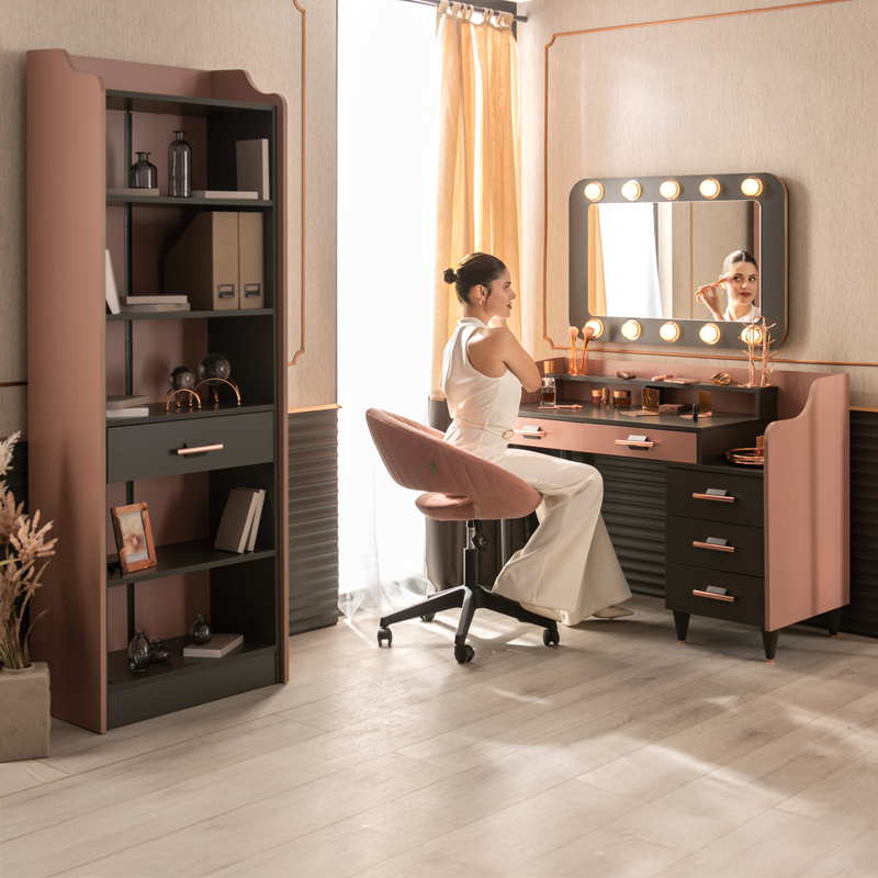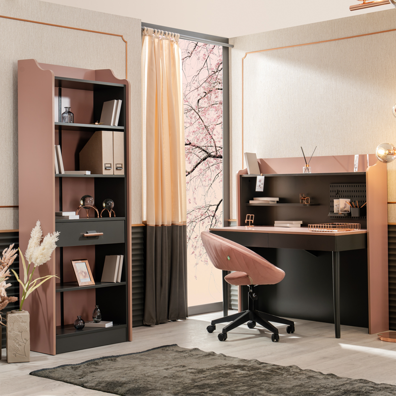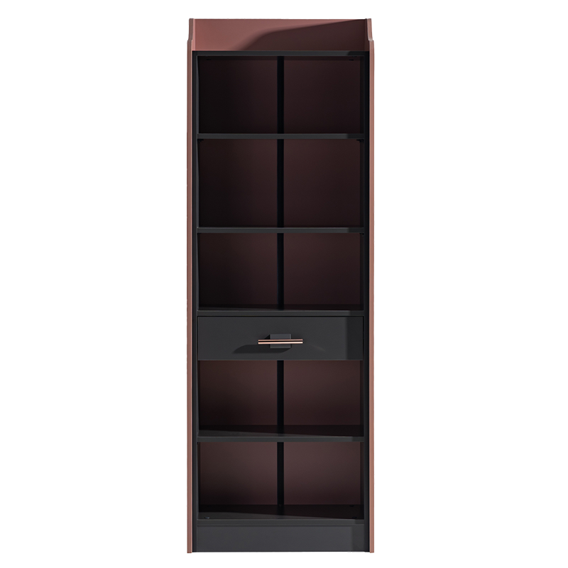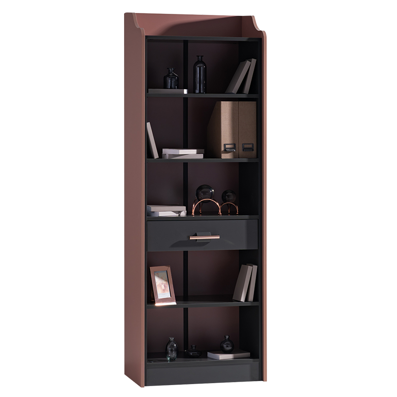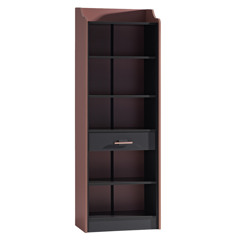 Етажерка за книги VALENCIA е проектирана, за да внесе ред и стил в стаята. Със своите 6 рафта и централно чекмедже с елегантна дръжка, тя предлага достатъчно пространство за съхранение както на книги и списания, така и на декоративни предмети. Всеки рафт издържа до 25 кг и може лесно да се премахва или пренарежда според нуждите. Чекмеджето е оборудвано с механизъм с плавно затваряне, осигуряващ тиха и безопасна употреба. Изработена от висококачествен 18 mm материал, етажерката е устойчива и стабилна, като съчетава модерен и изискан дизайн за елегантен завършек на интериора. Пълна информация за размерите и характеристиките на модела ще намерите в таблицата в таб/поле 'Техническа информация'.