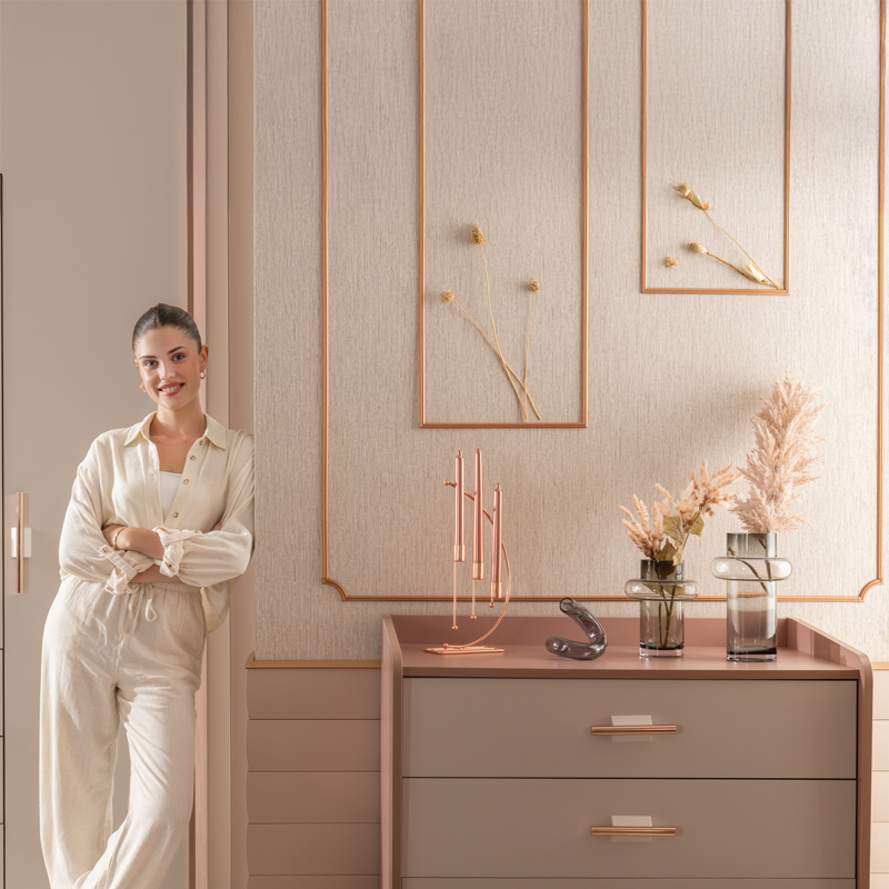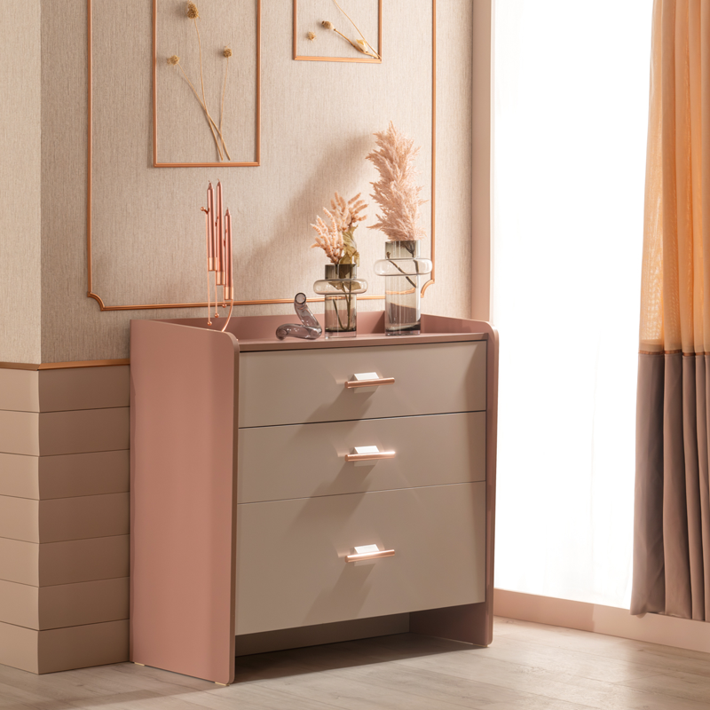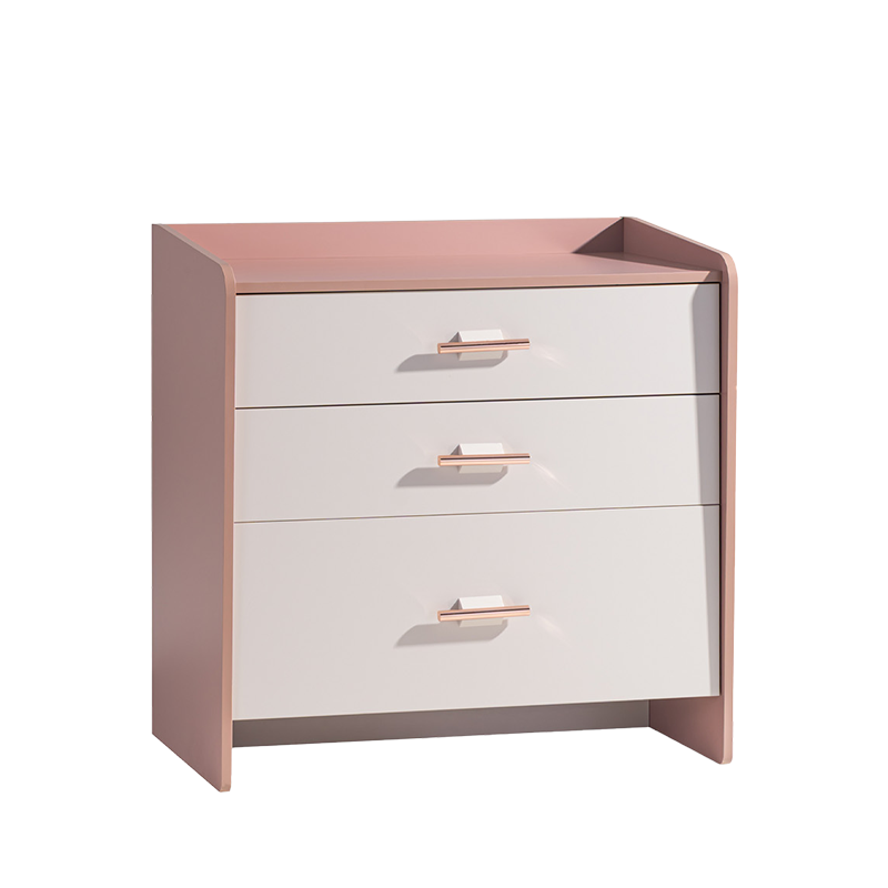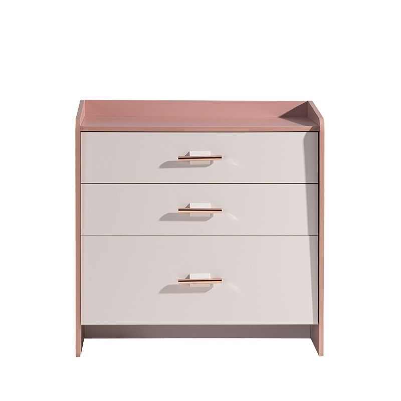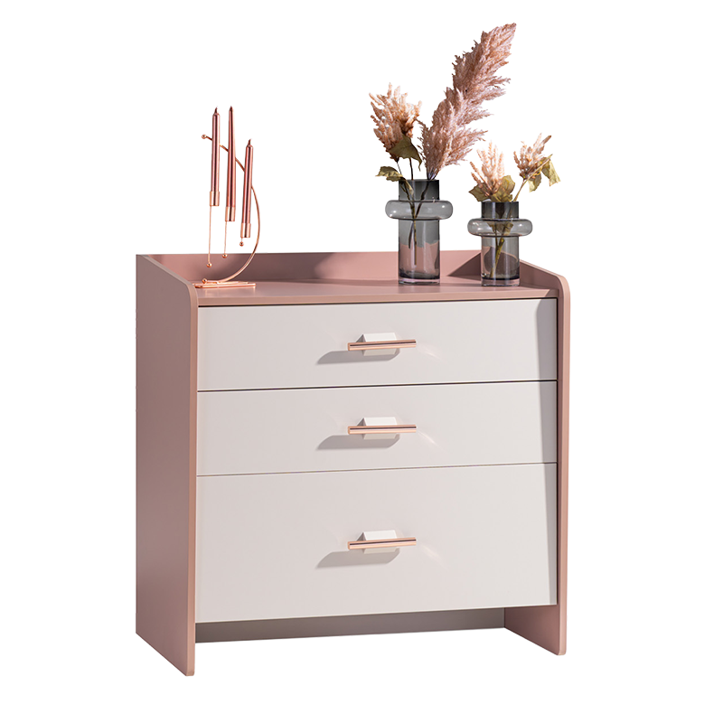 Детски скрин за дрехи ESTELLA съчетава функционалност, елегантност и безопасност. С три практични чекмеджета, той осигурява достатъчно място за съхранение на детски дрешки и аксесоари. Долното чекмедже е по-високо, което го прави особено подходящо за по-обемни вещи. Розово-златистите метални дръжки придават фин завършек и изискан акцент. Благодарение на вградената система с плавно затваряне, чекмеджетата се отварят и затварят меко и безшумно – за допълнително удобство и сигурност в детската стая. Пълна информация за размерите и характеристиките на модела ще намерите в таблицата в таб/поле 'Техническа информация'.