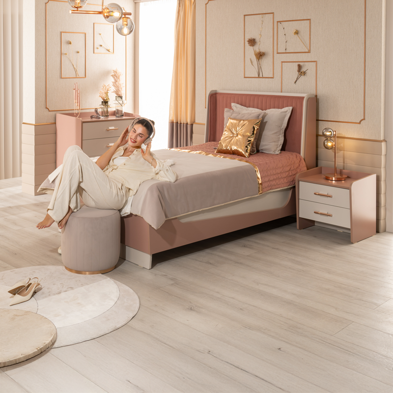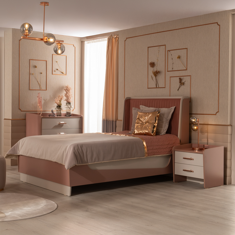 Нощното шкафче ESTELLA съчетава стил, функционалност и внимание към детайла – идеалното допълнение към всяка детска или тийнейджърска стая. Моделът разполага с просторни чекмеджета и широка горна повърхност, която осигурява удобно място за книга, очила или лампа до леглото. Изисканата визия е подчертано с розово-златист метален обков, а заоблените ръбове допринасят за още по-елегантна и безопасна визия на модела. Пълна информация за размерите и характеристиките на модела ще намерите в таблицата в таб/поле 'Техническа информация'.