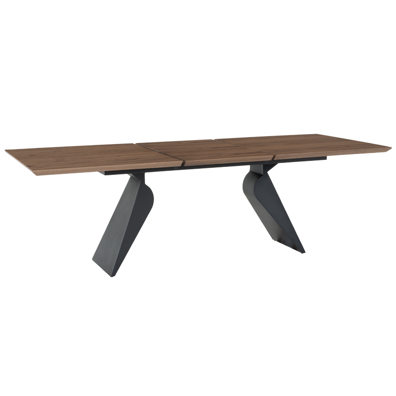 Разтегателна трапезна маса RATON впечатлява с модерен силует и функционален дизайн. Плотът е изработен от МДФ с естествен фурнир, с дебелина 25 мм, отличаващ се с издръжливост и гладка повърхност, която подчертава естествената текстура на дървото. Основата от праховобоядисан метал придава стабилност и характерен индустриален акцент. Масата разполага с механизъм за разтягане, чрез който дължината ѝ се увеличава от 180 до 240 см, осигурявайки удобно място за повече гости. Съчетава изчистена елегантност с практичност – идеален избор за съвременни трапезарии. Пълна информация за размерите и характеристиките на модела ще намерите в таблицата в таб/поле 'Техническа информация'.