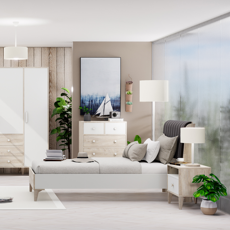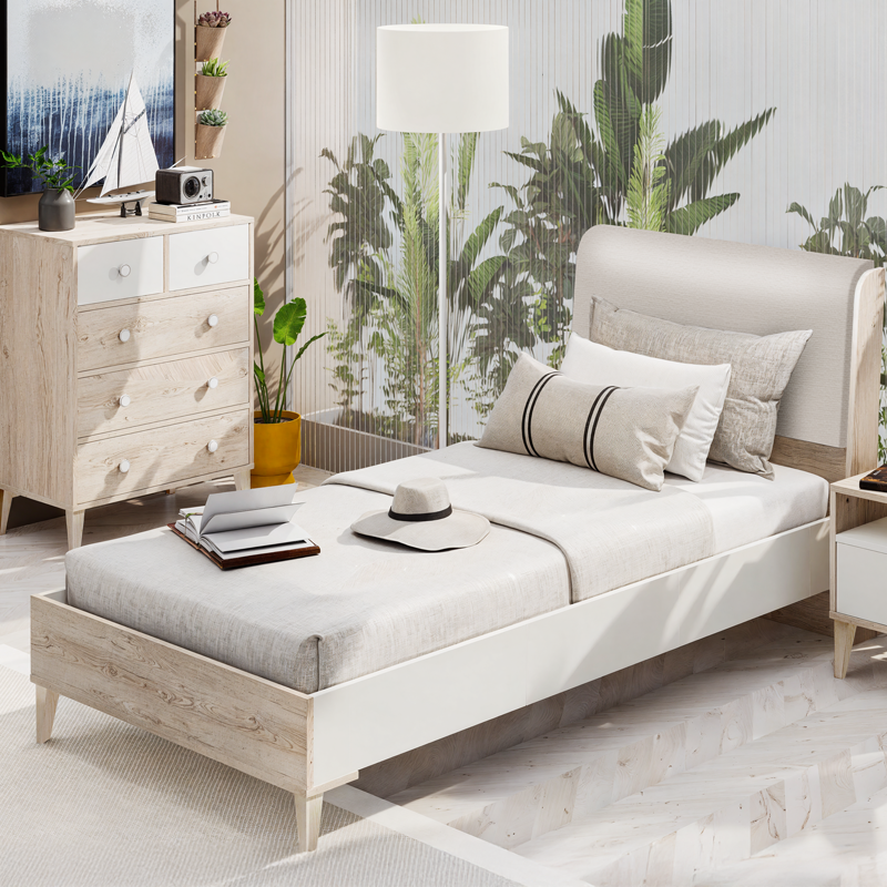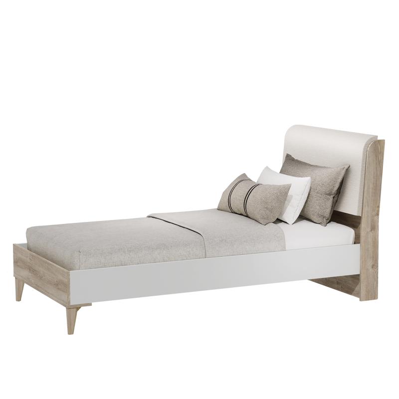 Детското легло EKVADOR 100 × 200 впечатлява с модерна визия и изискана комбинация от дървесни акценти и стилна текстилна тапицерия на таблата. Меката извивка на облегалката създава усещане за уют и елегантност, а висококачествените материали осигуряват стабилност, комфорт и дългогодишна надеждност. Леглото е съвместимо с матрак 100 × 200 см и се вписва перфектно в цялата серия EKVADOR, като допринася за хармонична и стилна атмосфера в детската или тийн стая. Пълна информация за размерите и характеристиките на модела ще намерите в таблицата в таб/поле „Техническа информация“.
