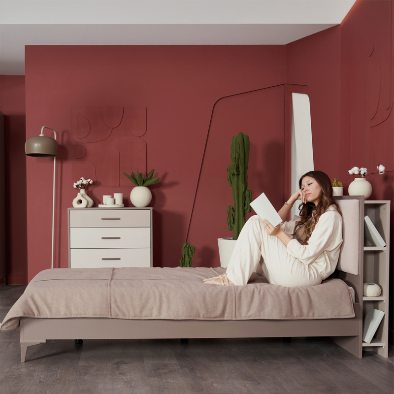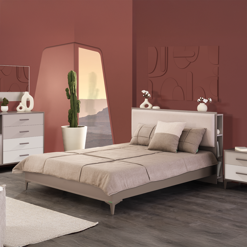 Легло RIGA разполага с тапицирана табла, която включва практични ниши – идеалното място за любими книги или лични вещи. Конструкцията е подсилена с допълнителна опора, за да гарантира стабилност и здравословен сън, а високите крачета позволяват лесно и безпрепятствено почистване под леглото. Изработено от висококачествени материали, леглото съчетава дълготрайна издръжливост с изключителен комфорт. Пълна информация за размерите и характеристиките на модела ще намерите в таблицата в таб/поле "Техническа информация".
