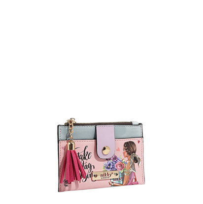 Калъф за карти. Подредете картите, сметките и дребните си пари с многоделния картодържател с цип. Изработен от висококачествена кожа. Основно закопчаване с цип и пискюл. Отделение с тик - так отпред. Златиста табелка с лого на Nikky отпред. Един прозорец за лична карта с 2 слота за кредитни карти отвън. Размер: 13,3 см х 8,9 см х 1,3 см.