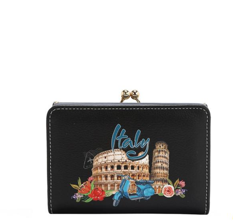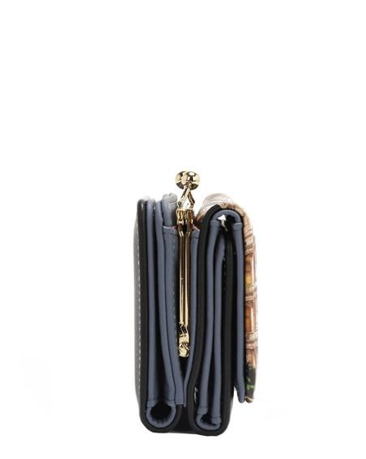 Външност от еко кожа. Преден капак с копче, който се отваря до тройно вътрешно пространство с 1 прозорец за лична карта във формата на сърце, 2 отделения за банкноти/пари в брой, 5 отделения за карти. Централен джоб за монети с копче. Заден портфейл с два капака и копче, който се отваря до 1 прозорец за лична карта, 2 отделения за банкноти/пари в брой, 4 отделения за карти. Вътрешна подплата от полиестер с принт. Аксесоари в златист цвят. Размер: 12,7 см (Д) x 3,8 см (Ш) x 8,9 см (В). Опаковано в кутия.