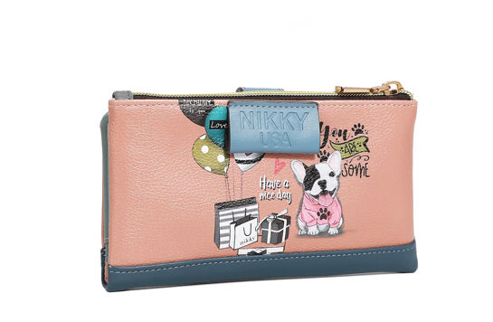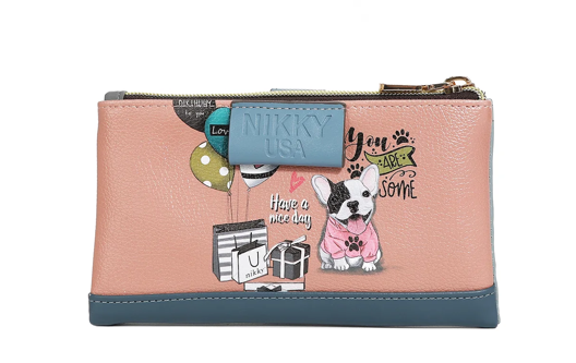Закопчаване с кръгъл бутон, на който е гравирано логото. Златна плочка Nikky с гравирано лого отпред. Подплата от найлонова тъкан Nikky с мотиви на сърца. Заден джоб с цип. Вътрешен централен джоб с цип. 2 прозореца за лична карта, 8 отделения за карти, 2 джоба за банкноти или сметки и 1 голям сгъваем джоб за хартиени пари. RFID (Radio Frequency Identity) защитна технология срещу кражба на данни. Вашата защита срещу идентичностна кражба започва с портфейла – RFID технологията блокира сигналите на четец и предотвратява неоторизиран достъп до съдържанието. Размери: 18 см (дължина) x 2.5 см (ширина) x 9.5 см (височина) Тегло: 0.34 кг Поддръжка: избършете с влажна кърпа