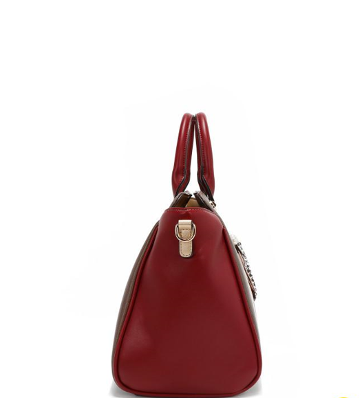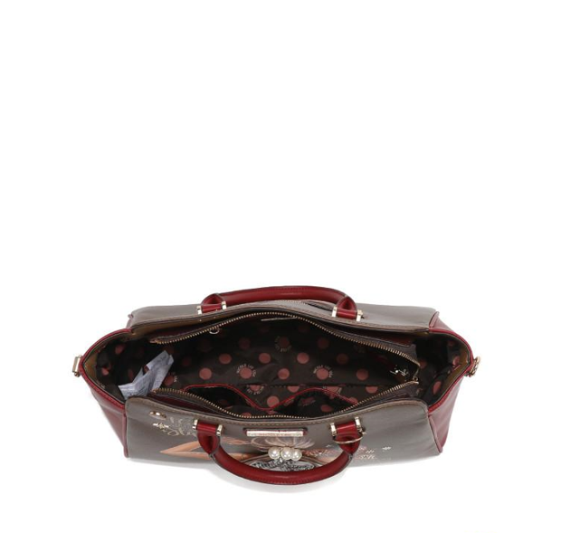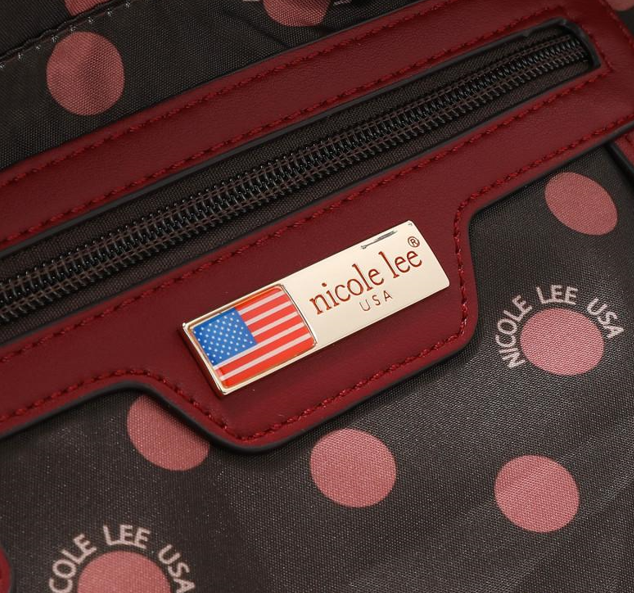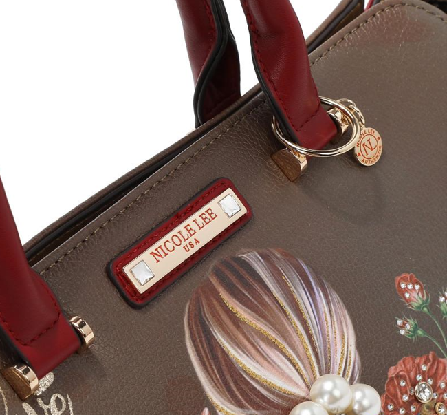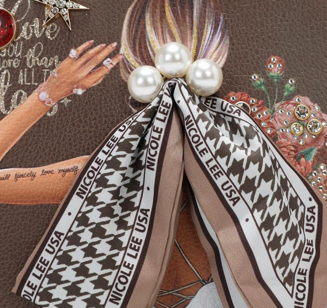 Външна част от висококачествена еко кожа. Структурирани, заоблени двойни горни дръжки с автентичен кръгъл медальон Nicole Lee. Закопчаване с цип. Предната част е декорирана с имитация на перли, диамантени циркони и елегантен детайл под формата на шал. Заден джоб с цип. Странични D-пръстени за допълнително прикрепяне на регулируема презрамка. Метални детайли в златист цвят. Вътрешна подплата от полиестер с точков принт. Вътрешен заден джоб с цип, лого и каишка за ключове. Размери: 39.4 x 16.5 x 26.7 cm