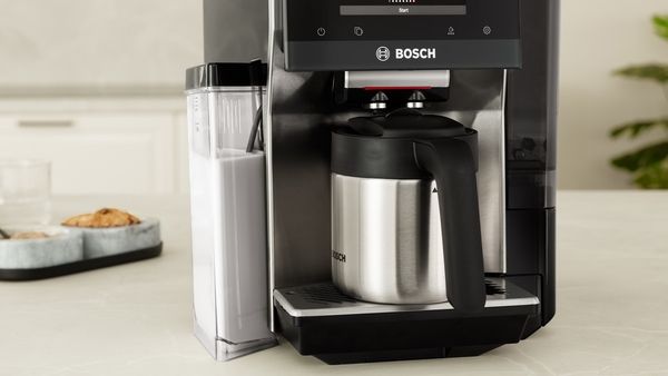 Bosch VeroCafe е висок клас напълно автоматичен кафе автомат, който съчетава международни кафе специалитети, интелигентни технологии и професионална система за млечни напитки в елегантен и интуитивен дизайн. С изцяло сензорния 5-инчов Active Select Display лесно избирате и персонализирате любимото си кафе само с едно докосване, а осветената зона за приготвяне и подгряващата поставка за чаши допринасят за истинско кафе изживяване у дома.Благодарение на AromaDouble Shot, машината приготвя силно кафе с по-малко горчивина чрез двукратно смилане и варене, като извлича максимален аромат без компромис във вкуса. С функцията AromaSelect можете да избирате между три ароматни профила – мек, балансиран или наситен, за да получите кафе точно по ваш вкус.Интегрираната млечна система с AutoMilk Clean се почиства автоматично с пара след всяка напитка, осигурявайки перфектна хигиена без допълнителни усилия. Дълготрайните Bosch Ceram Drive керамични мелнички гарантират равномерно и прецизно смилане за пълно разгръщане на аромата във всяка чаша.Функциите Coffee Playlist и Coffee Pot правят машината идеална както за ежедневна употреба, така и за гости – от приготвяне на цяла кана кафе с едно натискане до сервиране на последователни специалитети. С програмата Calc’n Clean поддръжката е лесна и ефективна, като удължава живота на уреда и запазва отличното качество на напитките.Чрез Home Connect и смартфона си получавате достъп до допълнителни рецепти, международни кафе специалитети и пълно дистанционно управление. С функцията Любими можете да запазите до 30 персонализирани напитки с индивидуални настройки за сила, аромат, количество кафе и мляко.Bosch Serie 8 VeroCafe е перфектният избор за ценителите на кафе, които търсят професионално качество, максимален комфорт и безупречен вкус – всеки ден, у дома.