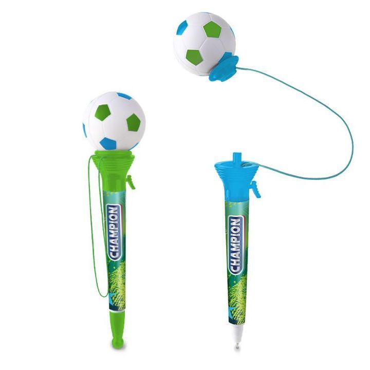 Този химикал може да прави повече от просто да пише. С вградена за изстрелване топка осигурява забавление в училище, офиса или в движение. Просто натиснете бутона, изстрелете топката, прикрепена към гумена връв, и я поставете обратно – включен защитен капак. Цвят на писане: син. Размер на топката: Ø около 3,8 см. Налично в 2 различни цвята: синьо, зелено. Размери на артикула с опаковката: 17,0 см x 3,5 см x 3,5 см
